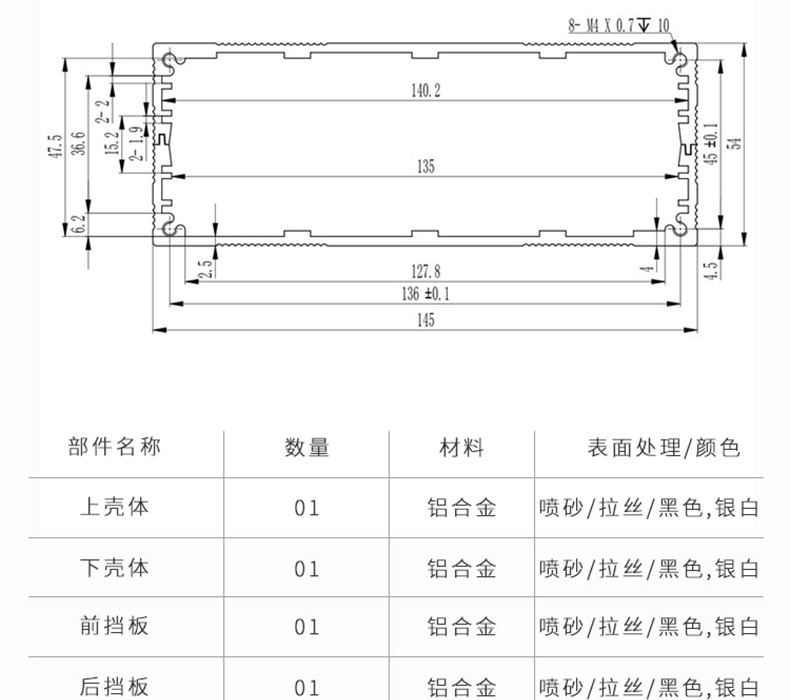 壳体材质:6063-T5挤压铝合金型材